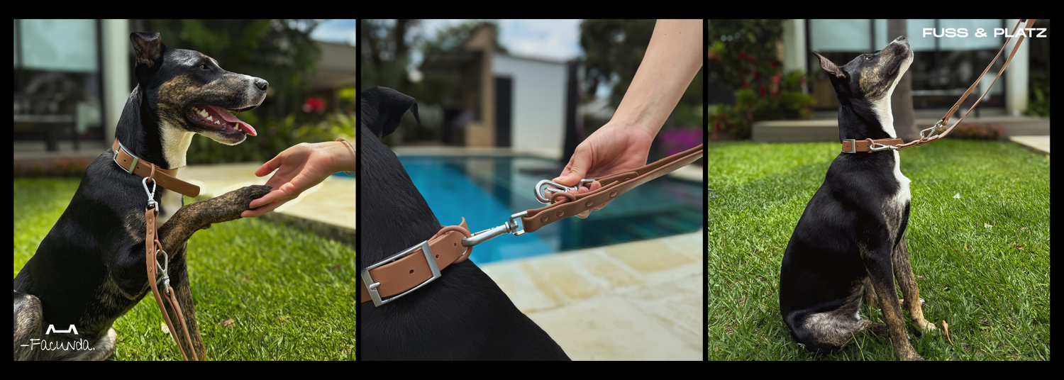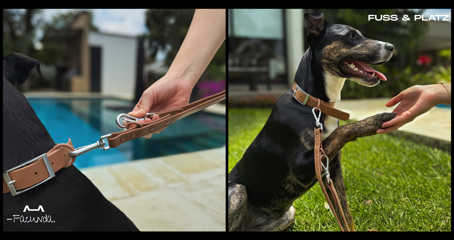 Ajusta el gancho al D-ring más cercano, y amarra el otro al collar o pechera. Así acortas la correa al instante para tener más control.